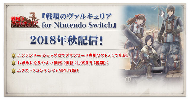 SEGA Games宣布,原定2018年夏季在Nintendo Switch推出的动作策略模拟角色扮演游戏《战场女武神4(戦场のヴァルキュリア4)》,现将延期至2018年秋季推出。